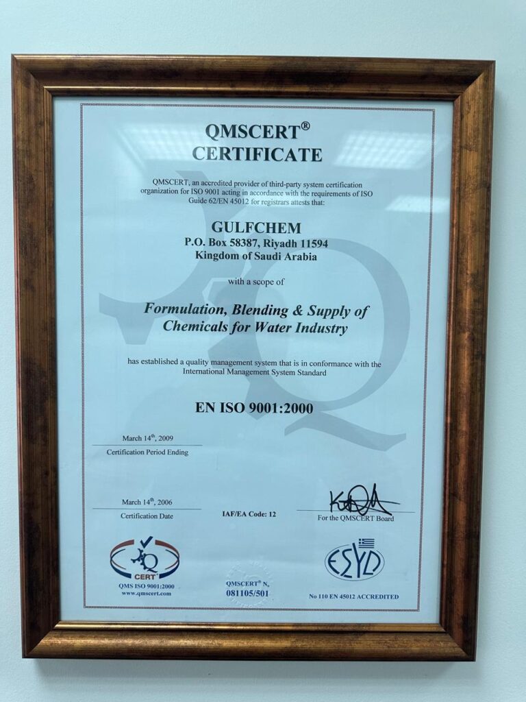 EN ISO 9001:2000 certification is also applicable to water treatment chemicals.