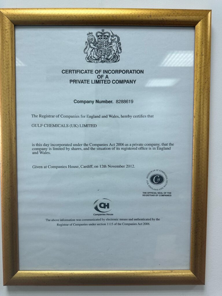 Issued by Companies House, this certificate confirms the official incorporation of Gulf Chemicals (UK) Limited as a private limited company in England and Wales. The company was registered on 12th November 2012 under the Companies Act 2006, with Company Number 8288619.